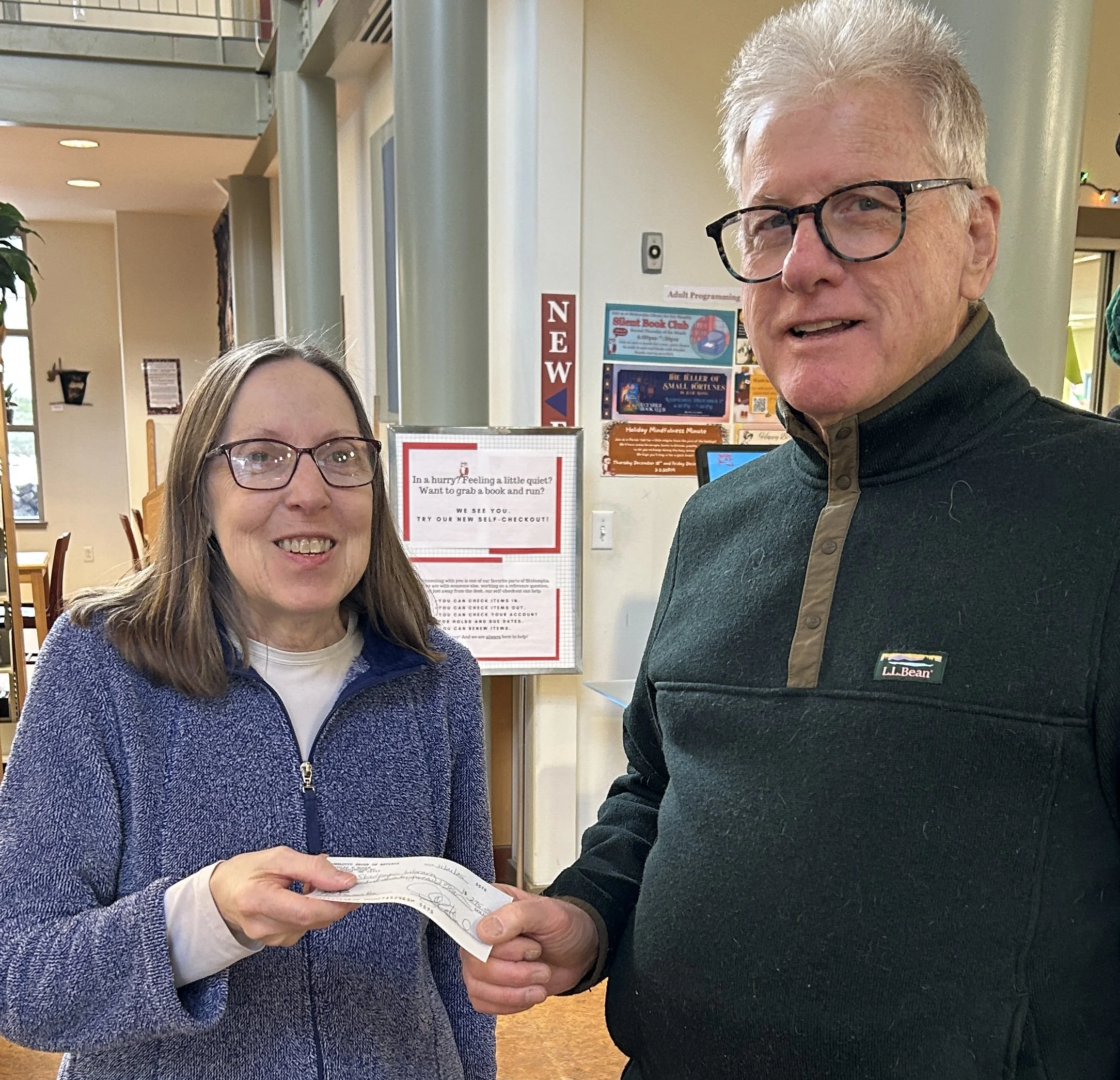 Gary Smith, PGA Board President gives Terry Hapach, Head Librarian at Skidompha a check for a day pass to Portland Museum of Art. The family pass allows 2 adults and 2 children a day at PMA. Any member of the public can reserve the pass and do not need to be members of the library.