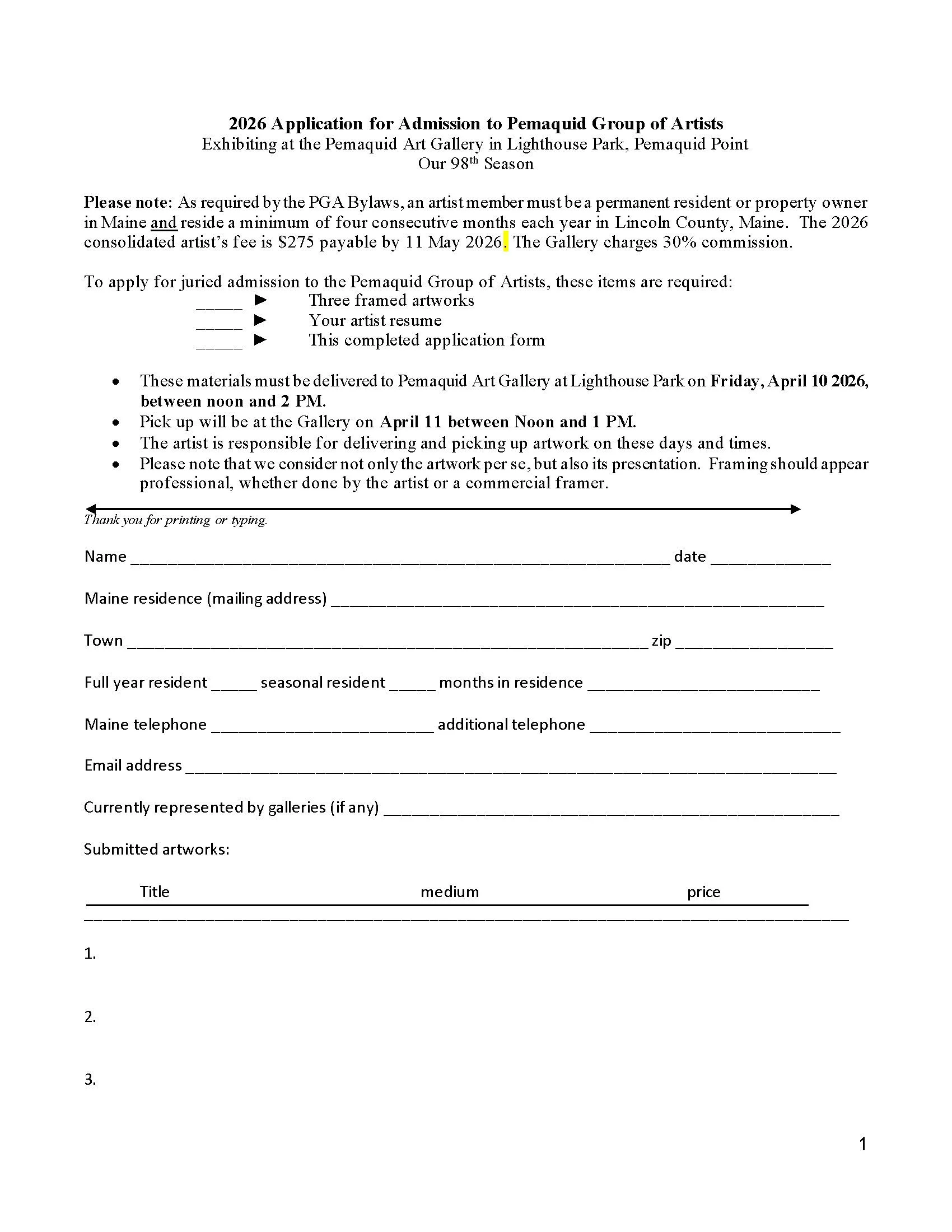 The Pemaquid Group of Artists will be jurying to select new member artists on Saturday, April 11th, 2026, for exhibit at the Pemaquid Art Gallery in our 98th season. Artists interested in applying for membership are required to submit three recent, original works of art, a short resume and a completed application with their art at the gallery on Friday, April 10 between noon and 2 PM. The application with additional information and requirements is available for download at pemaquidartgallery.com. Please direct any questions to Deb Paul, at debmpaul1954@gmail.com.